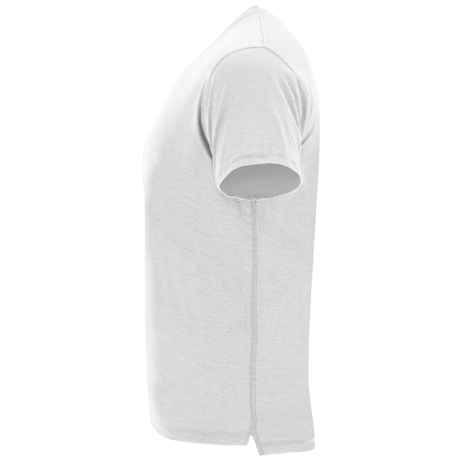 Футболка с короткими рукавами меланжевого цвета и асимметричным низом. Круглая горловина из той же ткани, украшенная оверлочным швом. Контрастные закрытые внутренние плечевые швы. Боковые швы, украшенные оверлочным швом. Боковые разрезы снизу. Спинка немного длиннее переда.