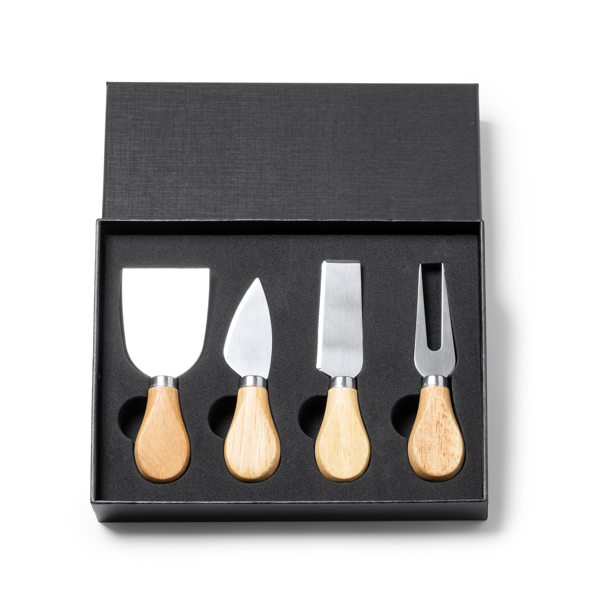 Набор для сыра с 4 приборами из нержавеющей стали с деревянной ручкой. Представлен в крафтовой упаковке.