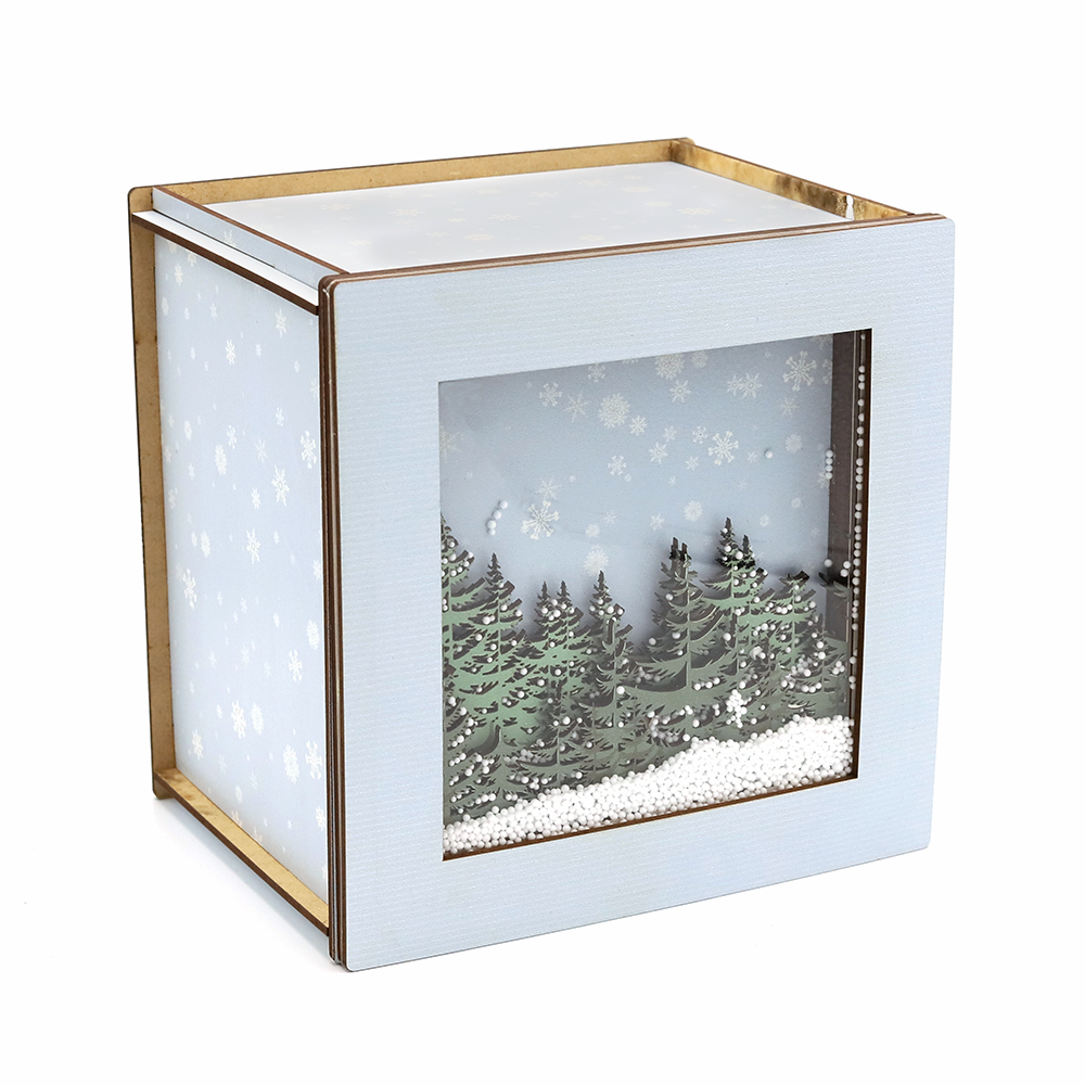 Лес в снегу (квадратная, светлая) - упаковка новогодняя из дерева
