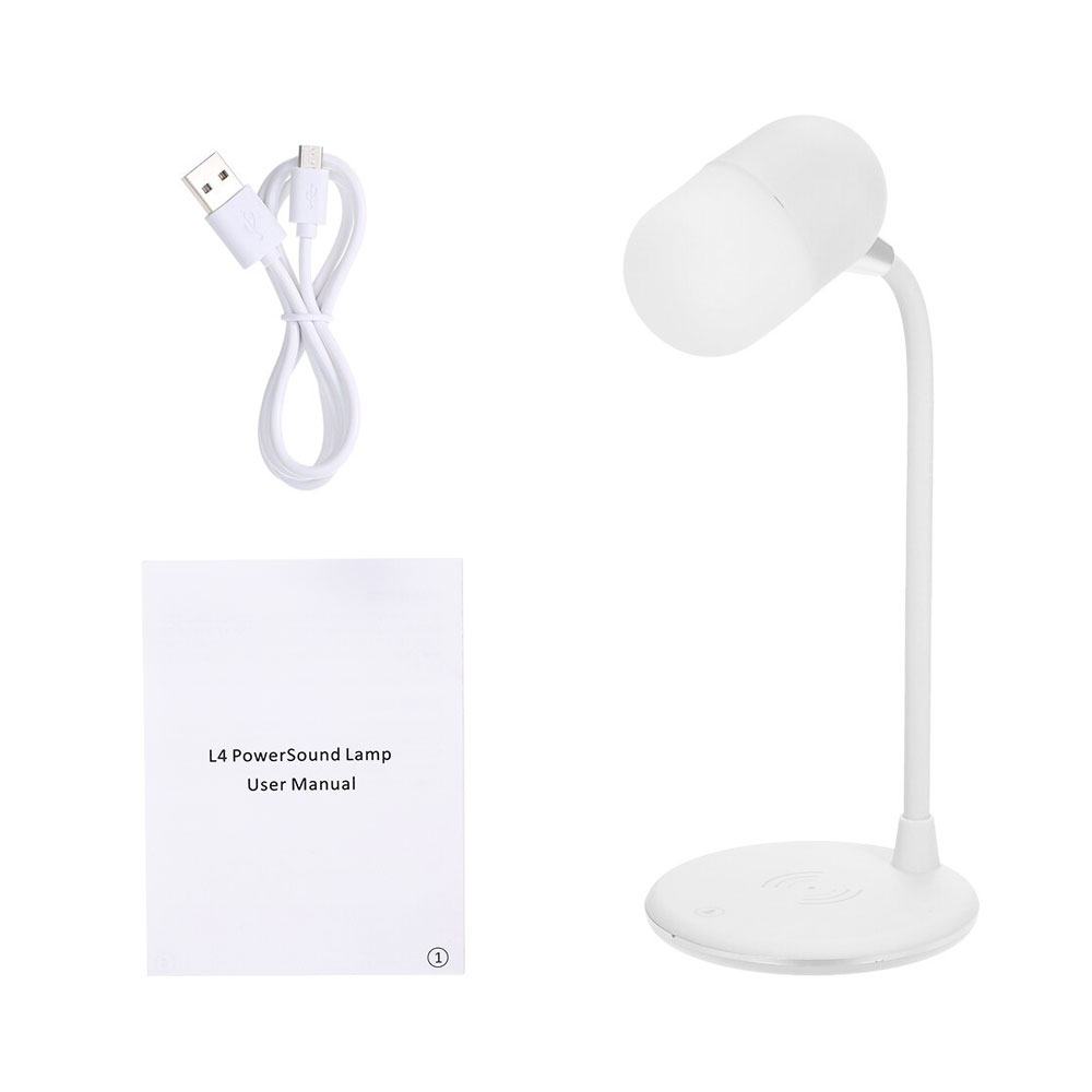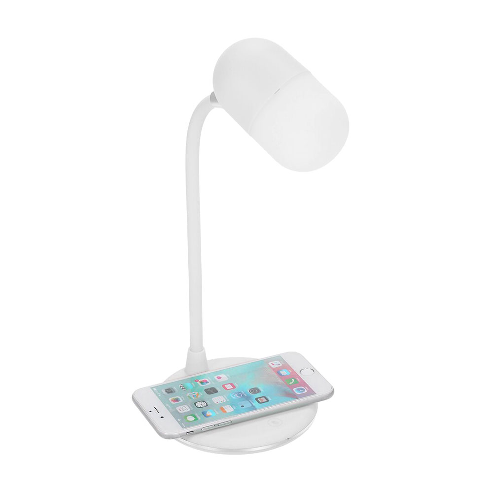 Настольная лампа с колонкой и беспроводной зарядкой Alladin. Тип светодиодного индикатора: cветодиодная панель (яркость 28LM±2), три режима настройки света (яркий, теплый, холодный), 7 светодиодов. Мощность: 5 Вт. Максимальная мощность беспроводного зарядного устройства: 5/10 Вт (опционально). Мощность динамика: 3 Вт. Вход:5V/3A. Версия Bluetooth: V5.0. В комплекте кабель USB и инструкция.
