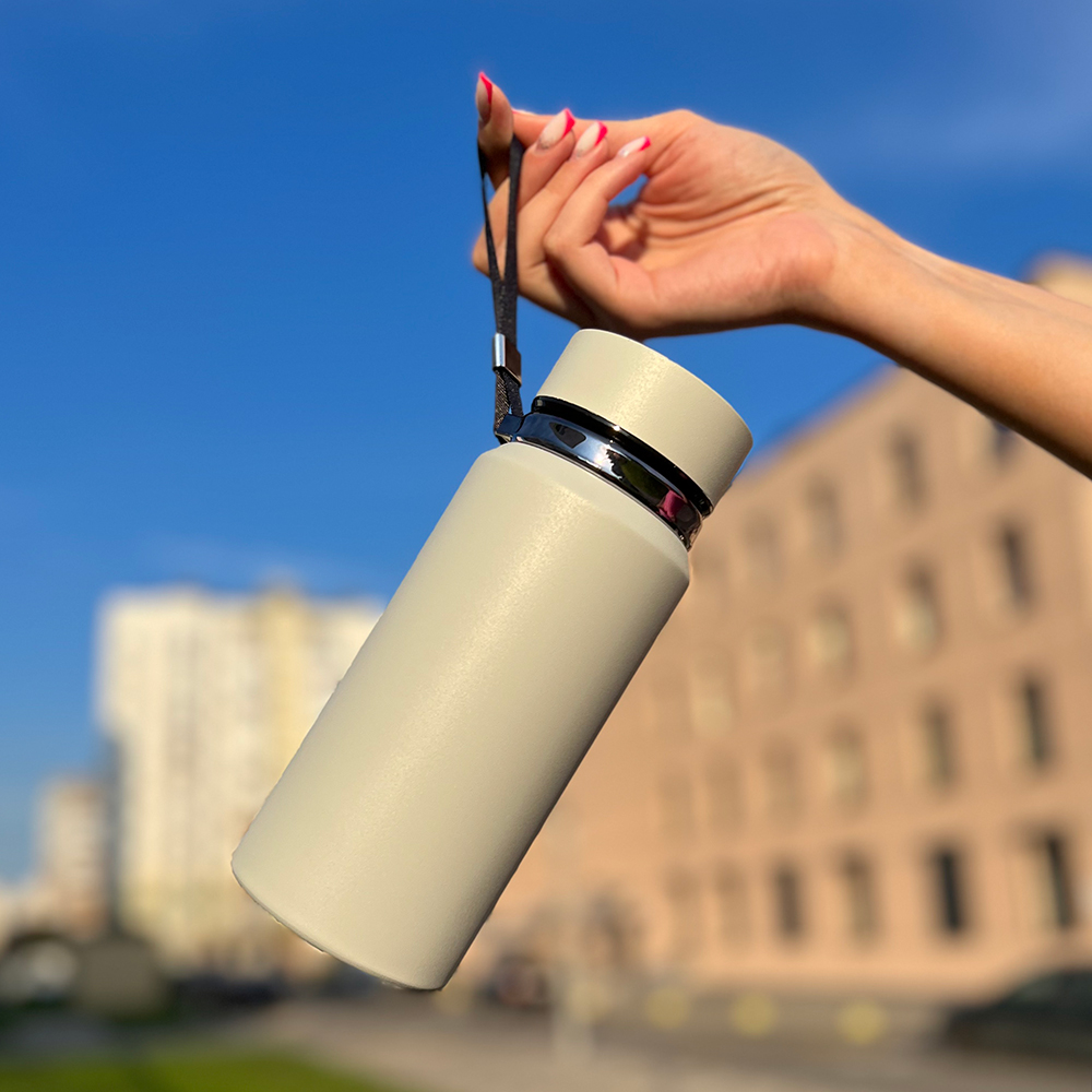 Термос имеет полуматовую обработку с эффектом текстурированности, что выражается в изменении цвета от серо-белого до абсолютно белого в зависимости от освещения. Чем естественнее и ярче освещение, тем более белым выглядит термос, что придает ему особую элегантность и изящество!