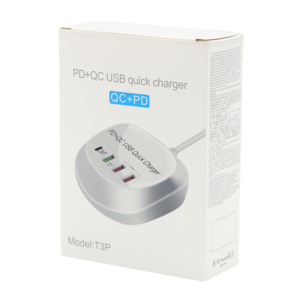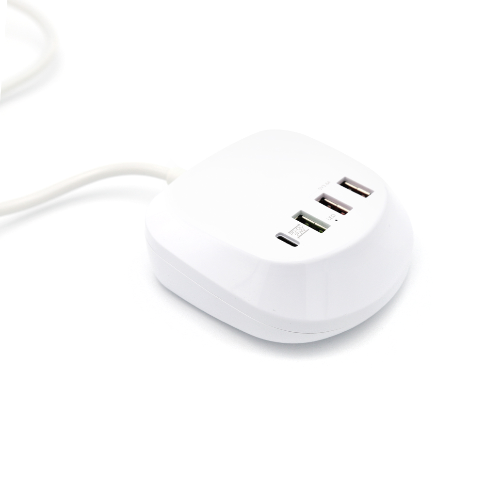 Универсальная платформа для зарядки гаджетов, с возможностью одновременного подключения 4 устройств. Порт Type-C подойдет для ноутбуков и нетбуков, порты USB позволяют при помощи кабеля с нужным типом порта осуществить зарядку мобильных телефонов, планшетов, наушников, часов. Наличие порта с функцией QC позволяет заряжать устройство в ускоренном режиме. Платформа выполнена из негорючего пластика, имеет встроенные компоненты предохраняющие устройства от перепадов напряжения. Длина шнура 105 см.