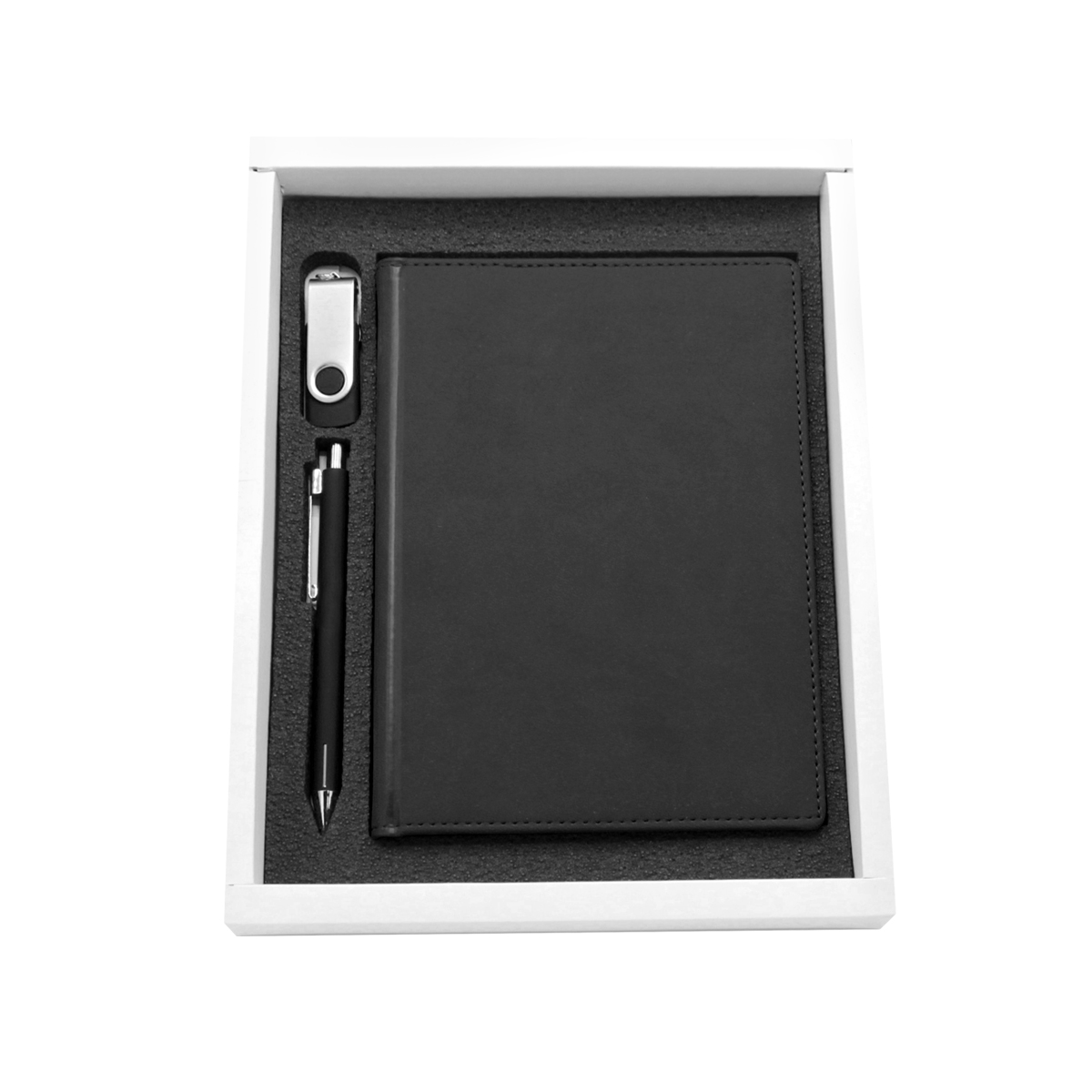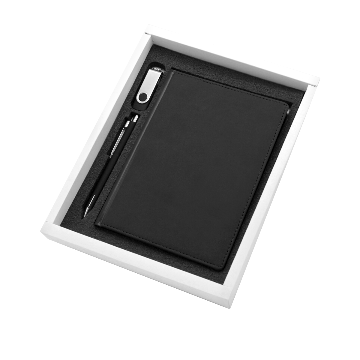 В состав подарочного набора входят: Флешка "Twist" 16 Гб, Ручка шариковая металлическая Elegant Soft, ежедневник Velvet A5 недатированный, подарочная коробка