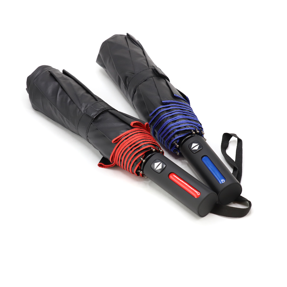 Автоматический противоштормовой складной зонт Sherp. Материал купола – эпонж. На таком материале вода превращается в капельки и скатывается, а сам зонт остается сухим. Цветной элемент на ручке – в тон купола. Ветрозащитная функция – спицы из стекловолокна, а специальное устройство препятствует поломке спиц при резких порывах ветра.