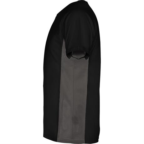 Спортивная футболка с короткими рукавами реглан, изготовленная из двух комбинированных тканей из полиэстера. Основная ткань — ткань bird's eye, а боковые вставки и рукав с внутренней стороны — с микроперфорированной ткани. Круглая горловина с усиленными