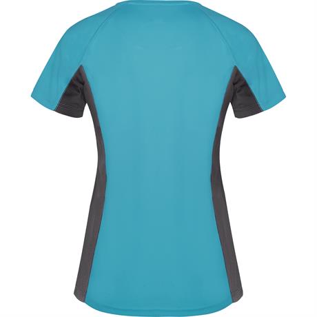 Спортивная футболка с короткими рукавами реглан, изготовленная из двух комбинированных тканей из полиэстера. Основная ткань — ткань bird's eye, а боковые вставки и рукав с внутренней стороны — с микроперфорированной ткани. Круглая горловина с усиленными