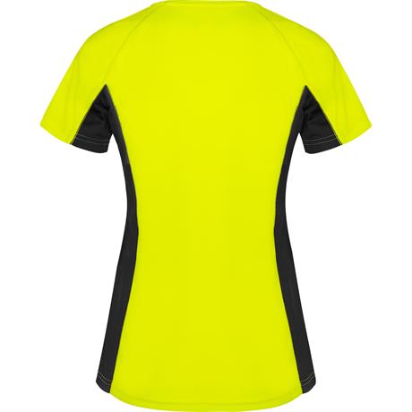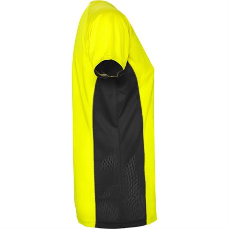 Спортивная футболка с короткими рукавами реглан, изготовленная из двух комбинированных тканей из полиэстера. Основная ткань — ткань bird's eye, а боковые вставки и рукав с внутренней стороны — с микроперфорированной ткани. Круглая горловина с усиленными
