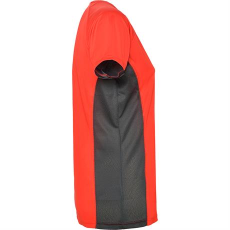 Спортивная футболка с короткими рукавами реглан, изготовленная из двух комбинированных тканей из полиэстера. Основная ткань — ткань bird's eye, а боковые вставки и рукав с внутренней стороны — с микроперфорированной ткани. Круглая горловина с усиленными